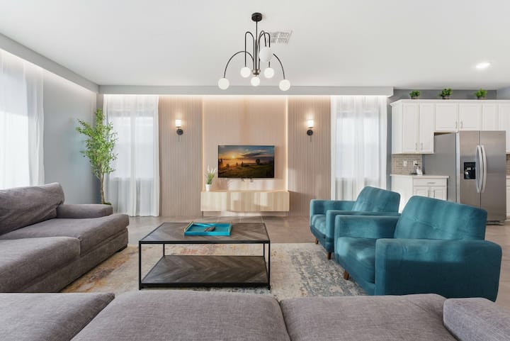✅ TV miestnosť s veľkou pohovkou a 65-palcovou TV.