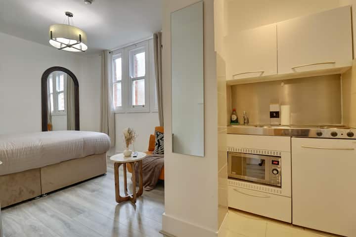 Užite si štýlový pobyt v tomto priestrannom garsónkovom apartmáne, ktorý je ideálny pre 3 hostí s pohodlnou malou manželskou posteľou a rozkladacou pohovkou. Priestor má prirodzené svetlo, inteligentný televízor, pracovný priestor a rýchle Wi-Fi pripojenie na internet, takže je ideálny na služobné aj voľnočasové pobyty.