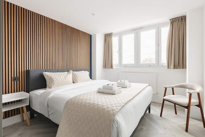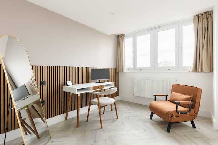 Vitajte vo svojom rafinovanom útočisku v srdci Londýna. Tento svetlý a priestranný apartmán s 2 spálňami ponúka premyslene navrhnuté usporiadanie, súkromný balkón a špecializovanú pracovňu – ideálny na voľnočasové aj služobné pobyty. Vďaka krásnym spálňam, modernému pohodliu a vynikajúcemu spojeniu je ideálnym základom na objavovanie mesta a zároveň si môžete vychutnať pokojnú atmosféru. Len 5 minút chôdze od stanice Edgware Road, s Hyde Parkom, Malými Benátkami a Paddington Basin v dosahu.