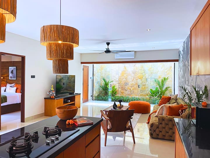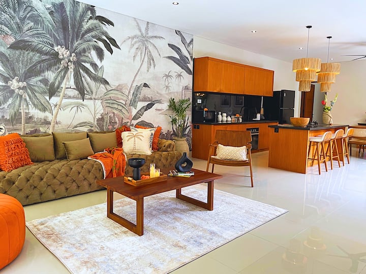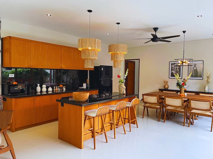 Vila je navrhnutá v uvoľnenom tropickom štýle inšpirovanom palmami a ponúka kuchyňu s otvoreným priestorom, jedálenskú a obývaciu zónu, ktorá sa otvára do bujnej záhrady s vodopádom. Užite si veľký súkromný bazén a chatku pri bazéne, ktorá je ideálna na oddych po návrate z pláže. Len pár minút od kaviarní, reštaurácií, butikov, plážových klubov a surfovacích miest, pričom stále ponúka úplné súkromie.