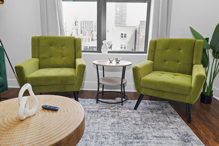 Vitajte v apartmáne State Suite, vašom umelecky navrhnutom mesteckom útočisku s 3 spálňami a 2 kúpeľňami v srdci chicagskej štvrte South Loop. Predstavte si, že sa zobudíte do mäkkého ranného svetla, ktoré preniká cez vysoké okná, popíjate kávu v priestore, ktorý spája elegantný mestský štýl s útulným pohodlím. Či už prichádzate na služobnú cestu, rodinný výlet alebo víkend plný zábavy, v tomto apartmáne sa stretáva pohodlie a sofistikovanosť.