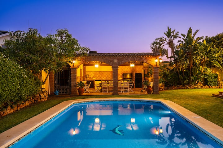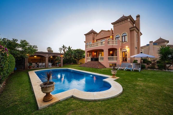 Táto vila so šiestimi spálňami (395 m2) sa nachádza na pozemku s rozlohou 700 m2 s vyhrievaným bazénom so slanou vodou (9,5 m x 5 m) v regióne Marbella, sa nachádza na pláži v tradičnom španielskom meste San Pedro de Alcantara v tichej urbanizácii. Len 400 metrov od pláže a 600 metrov od centra San Pedra sa nachádza na ideálnom mieste.