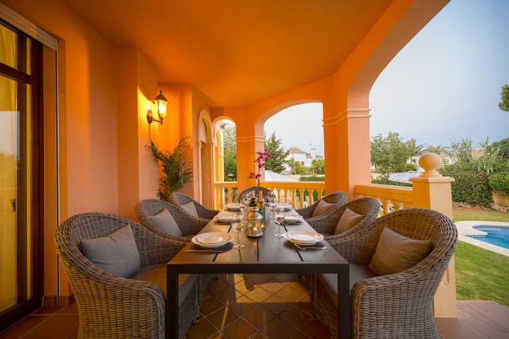 Puerto Banus je za rohom, 3 minúty autom a 30 minút chôdze po promenáde pri pláži, ktorá vedie až do Marbelly. Vila ponúka 395m2 rozložené na 3 podlažiach, 6 spální všetky s novými lôžkami a TV, 3 spálne s vlastnou kúpeľňou a 3 s prístupom k hornej terase. V priestrannej jedálenskej časti sa spolu pohodlne zožnia 12 osôb. Salónik má krásne posedenie s koženými pohovkami okolo televízie a krbu a má tiež biliardový stôl, ktorý ponúka skvelú zábavu pre vás a vašich drahých. Odtiaľto máte tiež prístup na hlavnú terasu domu s priestrannými posedeniami.