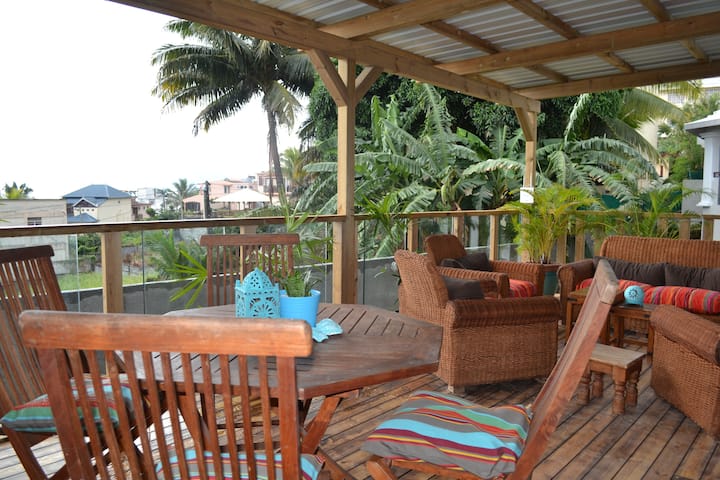 21LG Benitiers View - 7 m dlhá veranda s výhľadom na Ile aux Benitiers &Sea pre 2 vzduchové spálne s vlastnou kúpeľňou +otvorená kuchyňa, jedáleň a bývanie. Dostatok miesta aj na odkladanie športového vybavenia. Tento dom s vlastným stravovaním sa nachádza v tichej obytnej štvrti La Gaulette a má vlastný vchod a nachádza sa na 1 poschodí a otvára sa do spoločnej záhrady a bazéna s 2 priľahlými domami. Vitajte a rezervujte si všetky 3, ak sa veľa z vás pripojí k sviatkom!