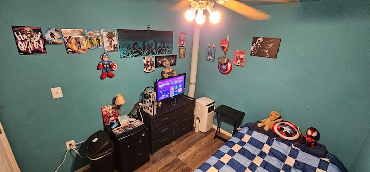 Izba č.4: Tento priestor je k dispozícii krátkodobo alebo dlhodobo. Táto izba je doplnkom pridaným do garáže, ktorá je sama o sebe tiež v procese izolácie. Klimatizácia a kúrenie fungujú skvele s nainštalovanou záložnou súpravou pre prípad, že omylom necháte dvere otvorené a potrebujete rýchlo vyčistiť miestnosť! Nájomcovia môžu využívať všetky zariadenia v spoločných priestoroch domu okrem prípadov, keď sa brloh alebo gauč prenajíma, a potom nezasahujte do súkromia týchto priestorov. Táto izba je navrhnutá pre väčšie súkromie mimo hluku ostatných ľudí v dome. Izba má tiež kódový zámok pre väčší pokoj na duši. Je zariadený manželskou posteľou, komodou, minichladničkou, televízorom a herným systémom (v súčasnosti pre Xbox One) a farebnými svetlami a zvýrazňujúcim osvetlením je k dispozícii aj pre zábavu. Dom je pomerne blízko Lackland AFB, ale nie PRÍLIŠ blízko, ak tomu rozumiete. Zvyšok garáže sa NESMIE používať ako osobný úložný priestor, ale môžete použiť prázdne police s povolením.
