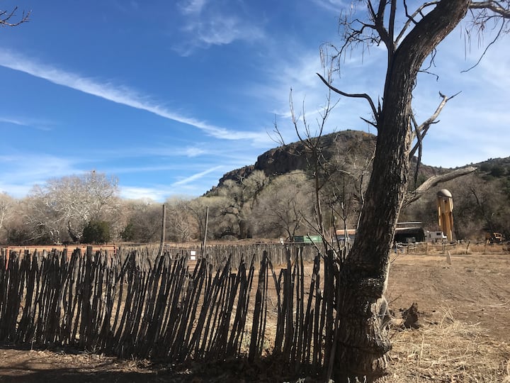 Uniknite a oddýchnite si obklopení prírodou a objavujte skalnaté kaňony, sledujte vtáky pozdĺž potoka Bear Creek, pozrite sa na hviezdy čistú tmavú oblohu alebo si zacvičte vážne oddych a užívajte si viac ako 280 dní slnka v Novom Mexiku v prenájme zrubov v Gila NM. Na samom konci 4-míľovej, dobre udržiavanej poľnej cesty, nájdete naše súkromné 360 akre obklopené bujným, zeleným bavlneným drevom, Jun ? a sycamore a domovom viac ako 200 zaznamenaných druhov pôvodných a migračných vtákov. (GPS: 32.969224, -108.525218)