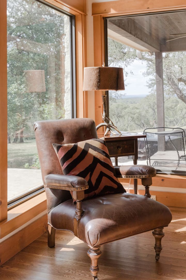 Obývaciu izbu tvorí vysoké stropy, kožený nábytok, 60-palcová TV s plochou obrazovkou a okolitý zvuk. Alebo nechajte televízor vypnutý, len si oddýchnite na gauči a pozerajte sa na stenu okien na pokojnú krajinu kopca s vysokými dubovými stromami a kopcami.