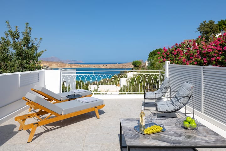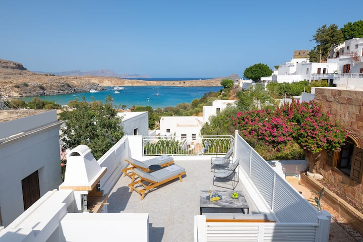 Úžasný výhľad na hlavnú pláž Lindos robí z vily jedinečnú.