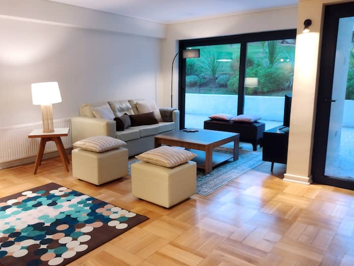 Apartmán sa nachádza vo veľmi exkluzívnej a bezpečnej štvrti El Golf len pár krokov od hotela W v Plaza Perú (3 minúty chôdze), najlepšej obchodnej a rekreačnej lokality v celom meste, v blízkosti nákupného centra Costanera Center (13 minút chôdze). Jedinečný, veľký apartmán (140 m2). Prvé poschodie s veľkou vlastnou záhradou so stromami.