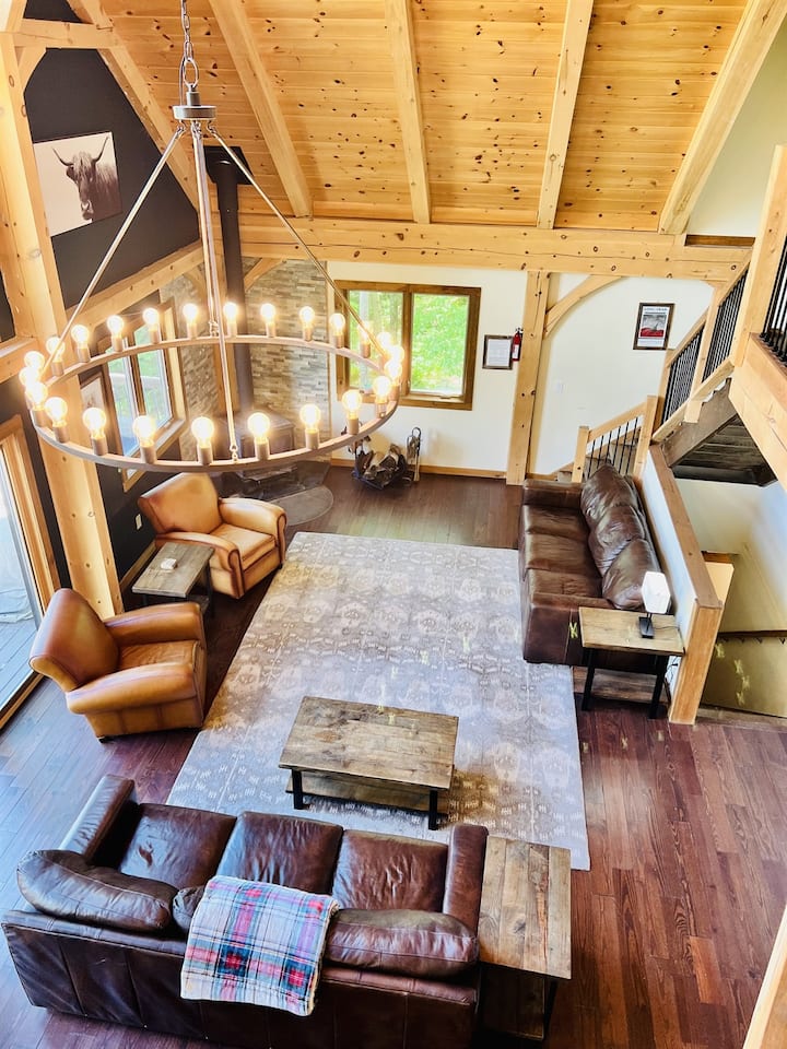 Vyjdite po schodoch a vstúpte do nádhernej skvelej izby so sporákom z tvrdého dreva a oknami od podlahy až po strop. Perfektné miesto na maznanie sa pri ohni na našich mäkkých kožených gaučoch a sledovanie pádu snehu alebo šumenie listov vo vetre počas jesene. K dispozícii je vlastný 10-palcovýfarmársky stôl, ktorý poskytuje dostatok miesta na peknú veľkú večeru obklopenú priateľmi alebo rodinou, polostrov s lavičkami s výhľadom do našej vlastnej kuchyne kuchára so 48-palcovým sporákom s dvojitou rúrou, spotrebičmi z nehrdzavejúcej ocele a žulovými pracovnými doskami. Keď idete smerom k zadnej časti hlavného poschodia, naľavo je kúpeľňa s vaňou/sprchou. Hlavná spálňa má 1 manželskú posteľ King a 1 jednolôžko na poschodovej posteli. Hlavná kúpeľňa má veľkú sprchu s bezrámovým sklom a dvojitým umývadlom. Druhá spálňa na strednom poschodí má oddelenú posteľ a dvojposteľ nad plnou poschodovou posteľou.