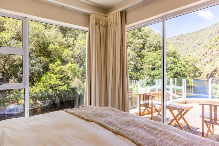 Náš dom je jedným z ôsmich jednotiek postavených na brehoch rieky Kaaimans. Pohodlne spí 8 osôb, vychádzanie z postele a do rieky. Otvorený plán kuchyne, rodiny a jedálne spolu s tajnou terasou a priestorom braai z neho robia ideálne miesto na spojenie s rodinou alebo relaxáciu v tomto malebnom rohu záhradnej cesty.