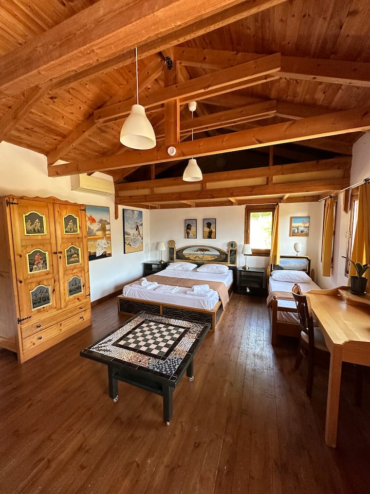 Sme rodina umelcov. Pracujeme v oblasti maľby, hudby a keramiky. Milujeme prírodu a pestujeme záhradu.
