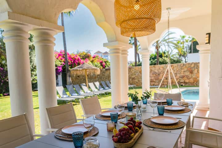 @LIRIOS VILLAGE MARBELLA je komplex piatich súkromných vil so 6 - 8 spálňami na bezkonkurenčnom mieste v Calle Los Lirios, Puerto Banus, len 7 minút chôdze od prístavu a pláží na slnku. Pozeráte sa na vilu 5, príjemné útočisko so 6 spálňami až pre 18 hostí. Očarujúci únik ponúka rovnú záhradu ideálnu na hranie pre deti, súkromný VYHRIEVANÝ bazén, gril a nádherný vonkajší priestor na posedenie s hojdačkou. Užite si toto pohodlné útočisko a vynikajúce služby.