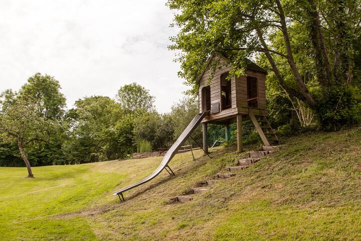 Zipline pre deti vo veľkej záhrade renovovanej stodoly