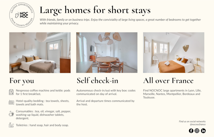 Poskytujeme viac ako 50 apartmánov v 7 mestách vo Francúzsku (Lyon, Lille, Nantes, Marseille, Toulouse, Bordeaux a Montpellier) na cestovný ruch alebo služobné cesty (semináre, školenia...).