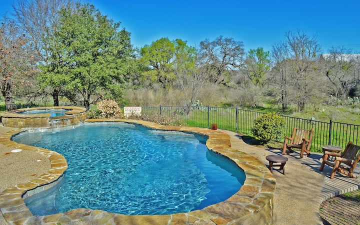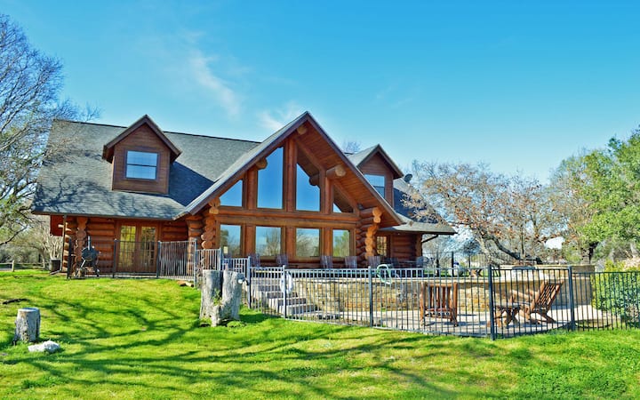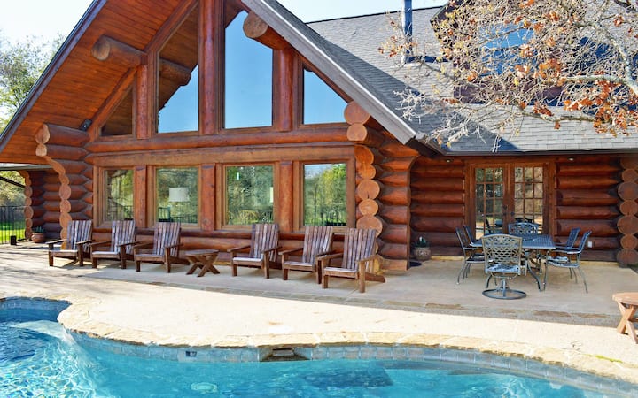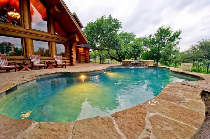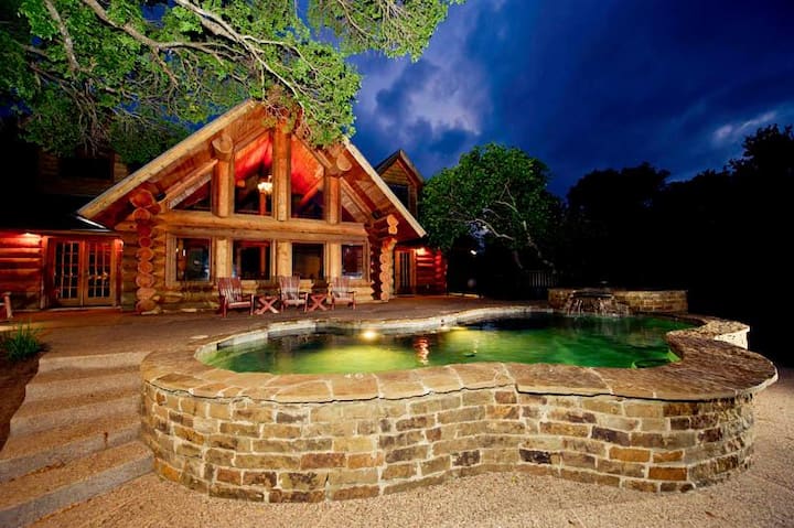 Rodinné útočisko LBJ Log Retreat s bazénom a vírivkou