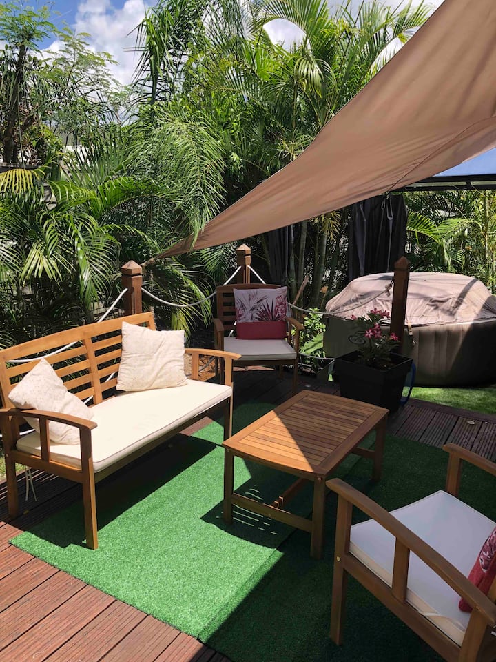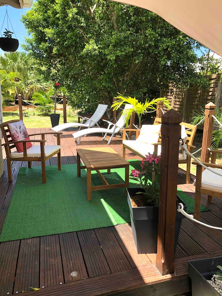Bungalov LYLANG je očarujúci a úplne nový bungalov s rozlohou 40 m2, všetko drevo, útulný a intímny, ideálny na romantický výlet alebo pár s deťmi, ktorý sa nachádza v krásnom meste Le Diamant.