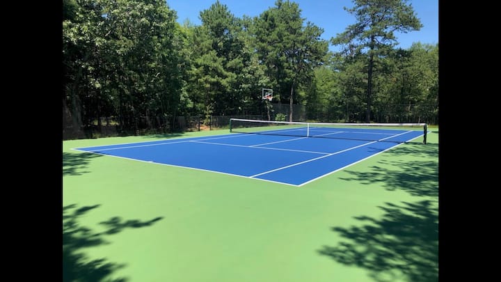 Váš vlastný súkromný tenisový kurt za každého počasia s basketbalovým stĺpikom – to všetko na vašom dvore! Predstavte si toto: ráno si zahrajte zápas, potom si oddýchnite vo svojom vlastnom vyhrievanom bazéne so zbraňami so slanou vodou a potom sa ponorte do novej vírivky s vírivkou. Rozsiahla vonkajšia terasa je ideálna na zábavu s viacerými priestormi na posedenie, grilom a dokonca aj vonkajšou sprchou. Bujné, odľahlé prostredie vytvára vzácny pocit pokoja, zatiaľ čo vonkajšie a vnútorné reproduktory SONOS udržiavajú náladu živú.