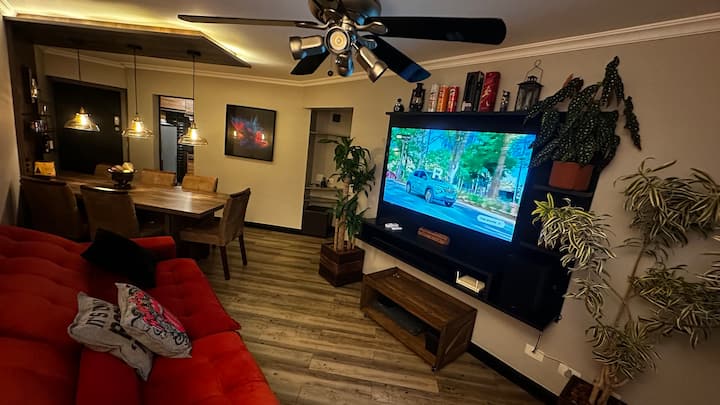 Prenosná klimatizácia s výkonom 14 000 BTU, duálny inverter, chladenie; Stropný ventilátor s 5 lopatkami (tichý) s diaľkovým ovládaním a 4 bodovými svetlami so stmievateľnými žiarovkami; Digitálny zámok s heslom alebo biometrickým prístupom; 60-palcový 4K Smart TV Samsung model 2022; Soundbar Samsung HW-A555 so subwooferom; Amazon Echo Dot s Alexou (hlasová asistencia: ovládanie TV a FireStick, budík, časovač, hudba atď.); Jedálenský stôl s nástenným panelom, minimalistickými policami a stropom s LED pásikom a tromi industriálnymi závesnými svetlami s vláknovými LED žiarovkami; Obrus; Stojacia lampa Louise Imbuia s diaľkovým ovládaním; Šesť čalúnených stoličiek; Delený záves Double-Vision; Závesný TV panel; Drevená váza s rastlinou pleomele; Drevená váza s kolieskami a rastlinou Dracaena fragrans (vodná tyčinka); Viacúčelový konferenčný stolík s poličkou a kolieskami; Dva 3D rámy; Dekoratívny rám Explózia farieb; Abstraktný, deleným rámom; Rôzne dekorácie; 4-miestna pohovka s výsuvnými sedadlami a sklopnými operadlami; 2 čierne vankúše 50x50; 2 vankúše Rolling Stones 40x40; držiak na poháre a diaľkové ovládanie na pohovku; 5G Wifi router; 6 kožených držiakov na poháre; krabica s hlavným náradím (kľúče, nôž, krajčírsky meter, kliešte, nožnice, multimeter atď.); nabíjačka smartfónu Qualcomm 3.0 turbo s káblom USB-C a ďalším káblom V8; koberec 200x150 cm; elektrický masážny prístroj na nohy - Homedics Shiatsu Air Pro (bez záruky na opravu alebo výmenu).[Izba 1]