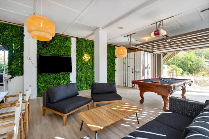 Náš plážový dvojdom je ideálny pre rozšírené rodiny s dvoma kuchyňami, 5 spálňami a 5 kúpeľňami s toaletou. K dispozícii je bazén a viacero vonkajších zábavných priestorov vrátane 5 verandy, z ktorých 4 majú výhľad na oceán, vonkajší jedálenský priestor pre 10 osôb a salóniky. Ak si prenajímate len jednu stranu, môžete s nami alebo inými hosťami zdieľať bazén v závislosti od toho, kto je v okolí. Všetkých hosťov žiadame, aby sa navzájom zdvorili, pokiaľ ide o hluk. Samotný dom sa nachádza na živom rohu pláže Folly Beach, jeden blok od ulice Center Street sa dostanete pešo k obchodom, reštauráciám, barom a miestnemu slávnemu rohovému trhu Bert 's. Táto blízka vzdialenosť je veľmi užitočná, pretože aj s golfovým vozíkom je takmer nemožné nájsť parkovisko. Od dverí k piesku je to menej ako 300 stôp. Mólo je len o jeden vstup na pláž a umožňuje krásne prechádzky a obrázky. Hneď pri našom vstupe na pláž sa nachádza miestne miesto na surfovanie - k dispozícii je pena a dosky! Spolu s bicyklami na plavbu po pláži!