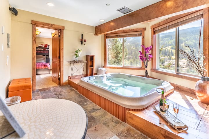 Tento nový kondomínium s 3 spálňami a OBROVSKOU LOFTOVOU spálňou, 3 kúpeľňami, má kapacitu 10 osôb, 2 hlavné spálne s manželskou posteľou s vlastnými kúpeľňami, dvojlôžkovú poschodovú posteľ s dvojlôžkovou spodnou časťou a veľký súkromný loft s (2) dvojlôžkovými posteľami a (1) dvojlôžkovou spodnou časťou (8 lôžok!). Ideálne pre 2 rodiny! Ponúka krásny panoramatický výhľad na svah zo súkromného balkóna. Vychutnajte si súkromnú vnútornú vírivku s výhľadom na svah a sledujte nočné lyžovanie zo svojej súkromnej vírivky.
