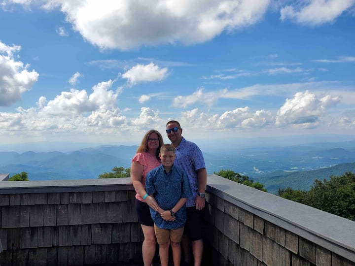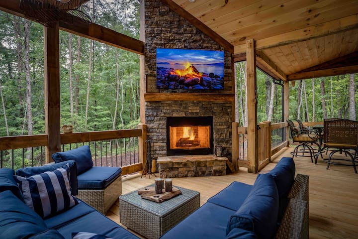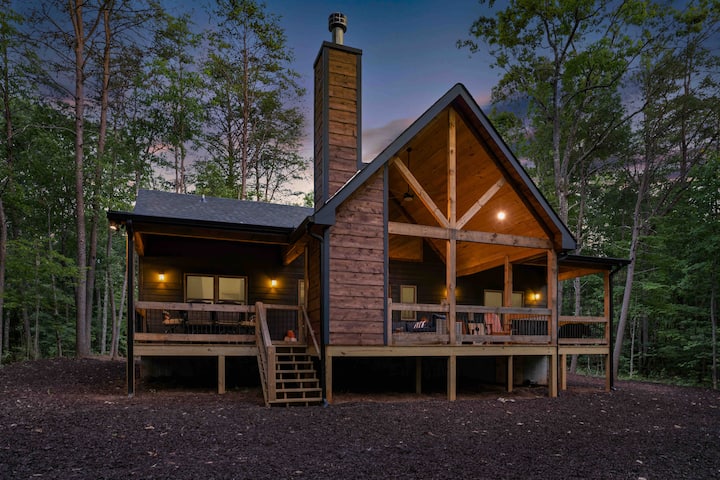 Naša úplne nová stavebná chata vám vyrazí dych od okamihu, keď prejdete okolo nášho malého jazierka, až do okamihu, keď otvoríte dvere a vstúpite do nášho malebného, na mieru postaveného bývania s 20 metrami až po stropné okná, ktoré umožňujú nádherný výhľad na náš vonkajší kozub a 1,5 akra lesa, ktoré obklopujú našu chatu. Naša otvorená koncepcia má pôvodnú modrú drevenú lištu, pôvodnú borovicovú podlahu a prirodzené svetlo. Vychutnajte si oddych pri plynovom krbe vo vnútri alebo si vychutnajte posedenie na zadnej verande a zároveň si vychutnajte vonkajší krb na drevo z kamenného dreva a relaxujte vo vírivke pre 6 osôb. Dostatok vonkajšieho obytného priestoru na čítanie knihy (knihy pre všetky vekové kategórie), hranie mnohých našich hier vrátane kukuričnej diery, Jumbo connect 4, háčik a hádzanie krúžkov, volejbalu/bedminton/koňských topánok/prenosný prsteň, dámu a Jengu, hádanky alebo sledujte svoje obľúbené relácie na 65-palcovej inteligentnej televízii Samsung nad vonkajším krbom, zatiaľ čo grilujete svoje obľúbené jedlá na našom novom plynovom grile a vyberiete si večeru vonku s naším jedálenským stolom pre 6 osôb s otočnými stoličkami a chladiacim boxom uprostred stola, aby ste udržali nápoje studené. K dispozícii je veľa priestoru na zadný dvor, kde môžete priniesť hry na rovinu, ktorá je obklopená prírodou, alebo sa rýchlo prejdite k malému jazierku a chytajte ryby (čo je 2 minúty chôdze od nášho objektu). Môžete si tiež oddýchnuť pri našom novovybudovanom ohnisku s odkladacími stolíkmi na pahýle na stromy na nápoje a dokonca s vami môžete vidieť, ako Big Foot varí viac! Veľa vonkajších možností na oddych, varenie alebo hranie!