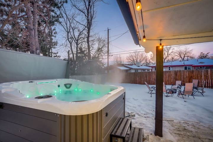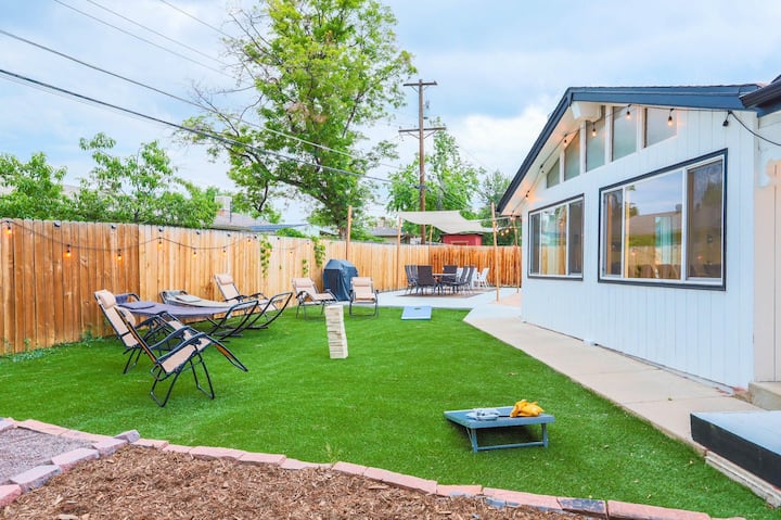 Užite si rozsiahly oplotený dvor vybavený ihriskom na pieskový volejbal, ohniskom a niekoľkými vonkajšími hrami, ako sú corn hole a Jenga. Krásna terasa s hojdacími sieťami a grilom pre vaše potreby na grilovanie. Tento vonkajší priestor s pohodlným posedením a krásnou krajinnou úpravou je ideálny na ponorenie sa do slávneho počasia v Colorade a užívanie si času s priateľmi a rodinou.