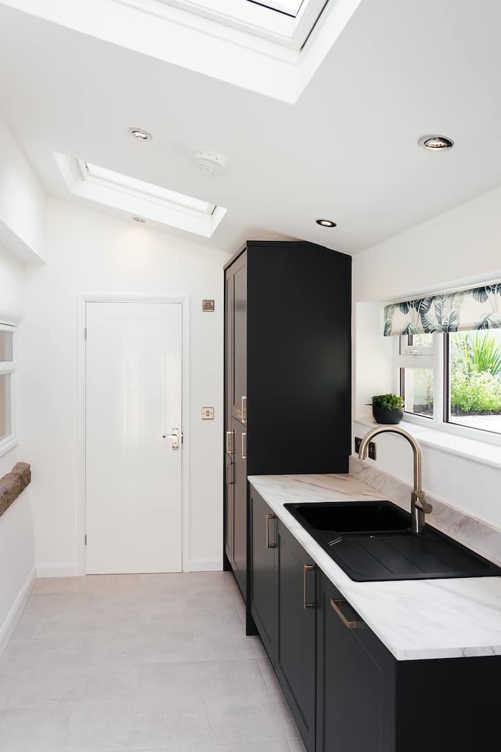 - Moderná kuchyňa/jedáleň s dodatočnou kuchyňou/technickou miestnosťou, ktorá vám poskytne veľa priestoru na varenie! Vybavené elektrickou rúrou a sporákom, mikrovlnnou rúrou, rýchlovarnou kanvicou, hriankovačom, chladničkou pod pultom s mraziacim boxom a ďalšou plnohodnotnou chladničkou/mrazničkou v technickej miestnosti.