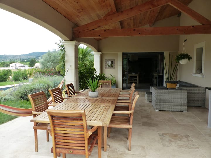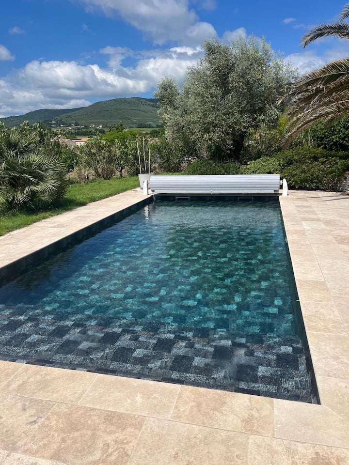 Bazén je obklopený ležadlami a je ideálny na oddych. Záhrada s rozlohou 1500 m ², plne oplotená, zaisťuje bezpečnosť a súkromie, ponúka hry na pétanque pre príjemné vonkajšie chvíle a pingpongový stôl.