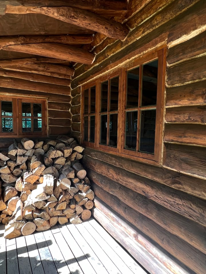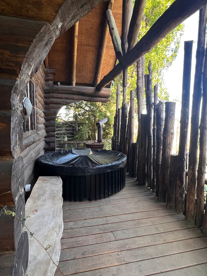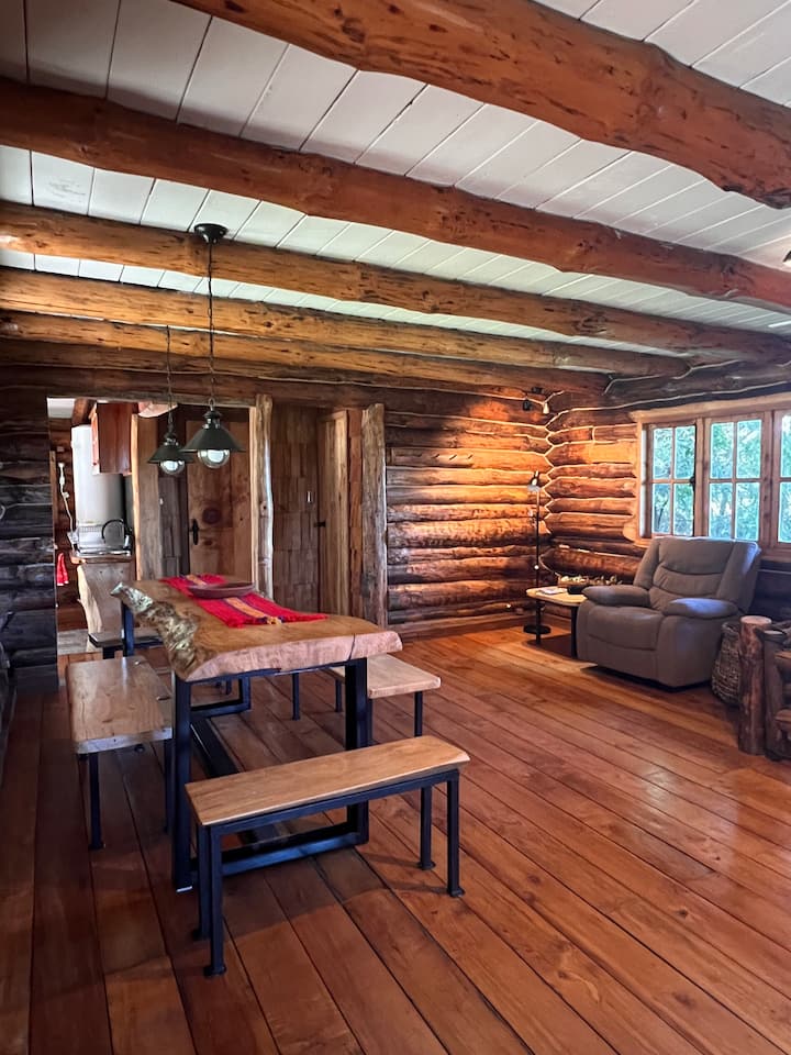 Útulná chata s nádobou na vodu a rodinným šarmom