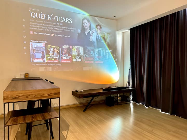 Máme super obrovské a široké 150-palcové projekčné plátno a soundbar, aby ste si mohli oddýchnuť a užiť si skvelú filmovú noc!
