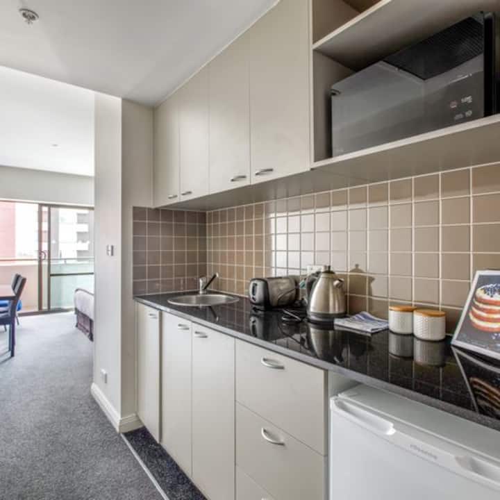 Krásna garsónka s manželskou posteľou, balkónom a bazénom
