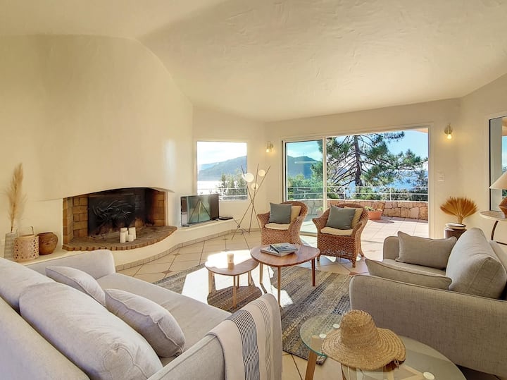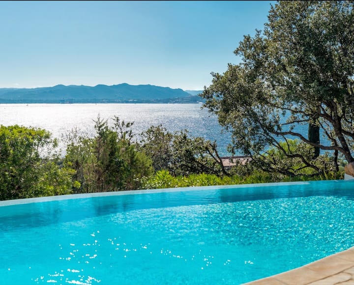 - Veľmi pekný hlavný apartmán so 160 lôžkami s vlastnou terasou a nádherným výhľadom na more s výhľadom na záliv Porto Vecchio, prístup z vnútra vily.