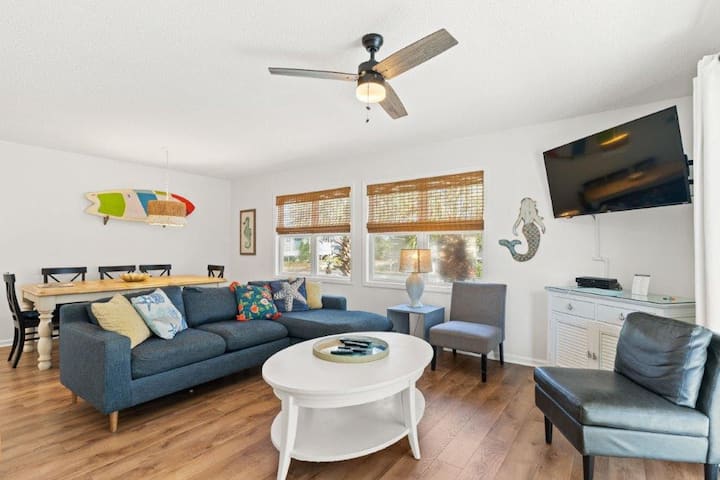 · Pohodlné vybavenie: Zostaňte v spojení vďaka bezplatnému pripojeniu Wi-Fi. Práčka a sušička v jednotke. Uchovávajte všetko plážové vybavenie v prízemnej vonkajšej úložnej skrini. Plážový voz, boogie dosky, plážové stoličky, veľký chladiaci box s kolesom, slnečníky, plážové hračky a ďalšie sú k dispozícii! Vychutnajte si grilovanie na komunitných griloch a ak chcete zmeniť pláž, ochlaďte sa v priestrannom komunitnom bazéne!
