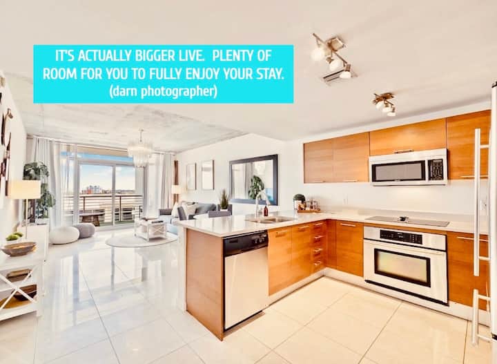 Fantastic Sun-Filled condo with Resort Style Pool, Sunset Rooftop Lounge and BBQ Area with Private Putting Green, Table Tennis, Fitness Center, Front Desk Personnel and (1x) Indoor Secure Parking Space, EV charging station, coffee station (small fee), Foosball,