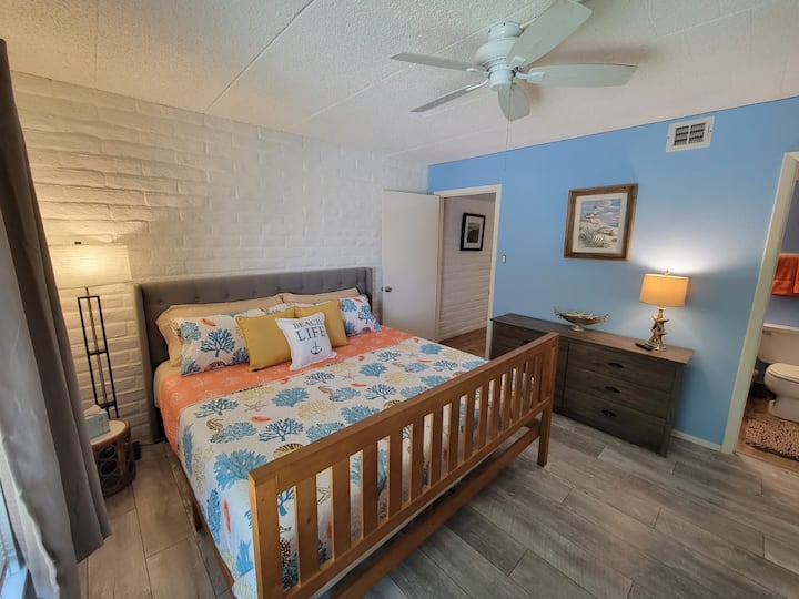 1sp/1kúpeľňa s manželskou posteľou, výhľadom na bazén a prístupom na pláž