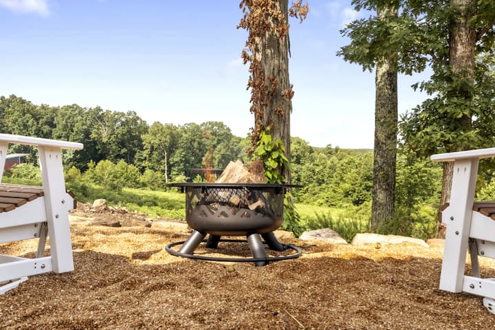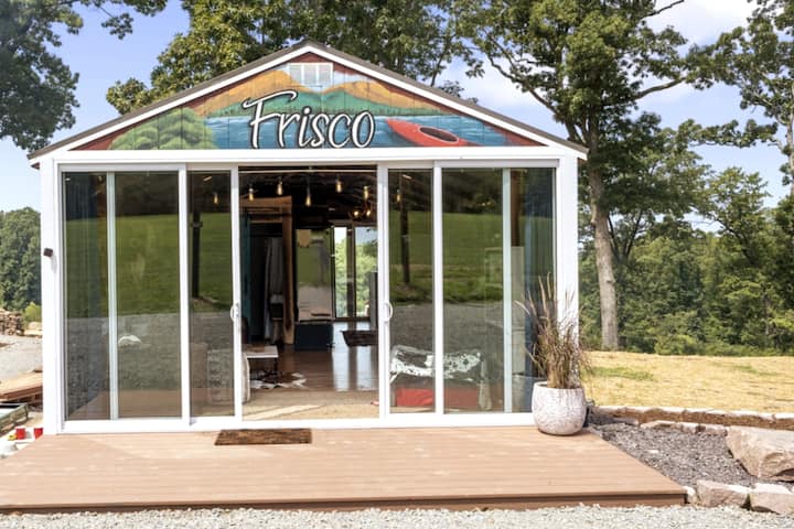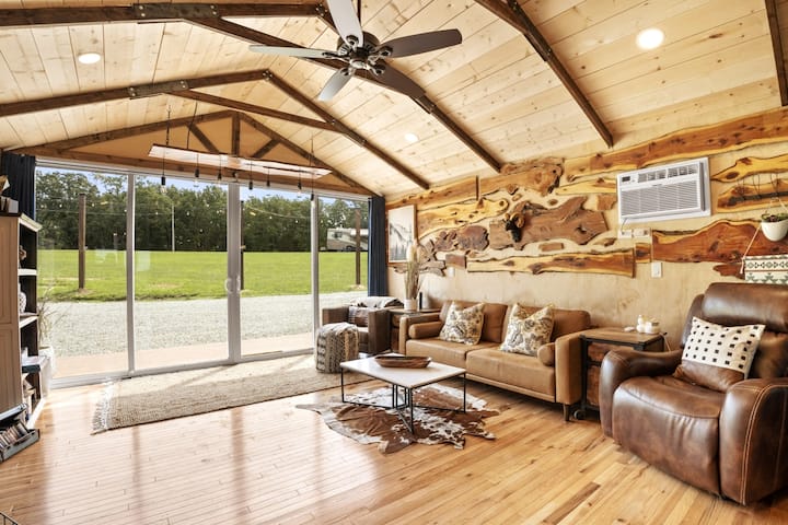Ubytujte sa v tomto jedinečnom minidome s rozlohou 600 štvorcových stôp osobne navrhnutého minidomu na 10 akroch. Vďaka veľkým posuvným skleneným dverám od steny k stene je tento priestor otvorený a priestranný. Nástenné k stene zatemňujúce závesy pre súkromie a pokojné spanie. Komunitné vonkajšie stolovanie a ohnisko s výhľadom do údolia z najvyššieho bodu v St v okrese Francois County. Miesto na oddych a oddych v pokojných kopcoch a údoliach francúzskej dediny. Prineste svoje šteňa, preskúmajte objekt, navštívte vinárstvo Terrace Winery, zahrajte si bazén v bare a gril Dori 's Bar & Grill, choďte v podzemí do Bonne Terre Mines, túru Pickle Springs, strávte deň ochladzovaním sa v rieke v štátnom parku St. Francois, choďte na 4 kolesá v Old Lead Belt v St. Joe State Park, Star sa pozerá v noci s ďalekohľadom zo zadnej verandy....