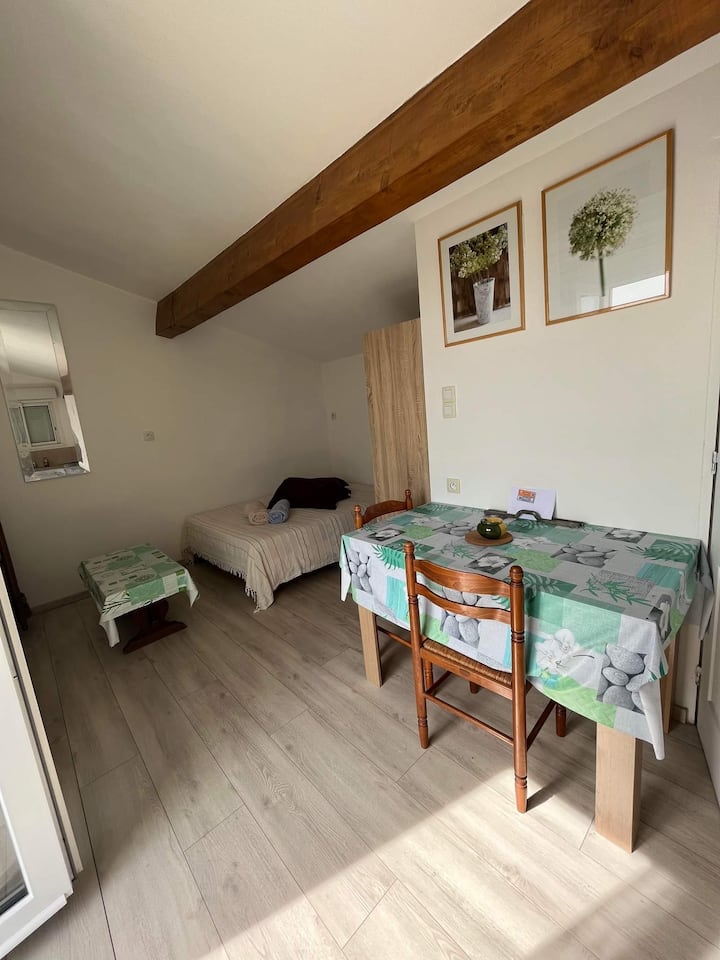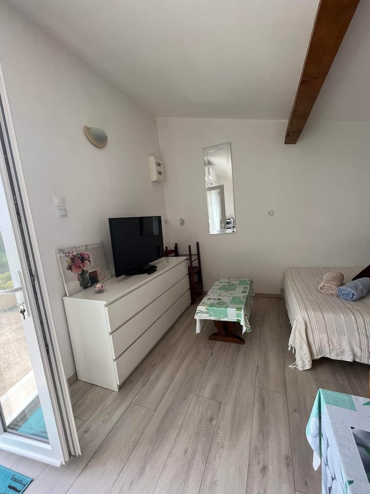 Štúdio s vlastným vonkajším vírivkou v pokojnom prostredí.