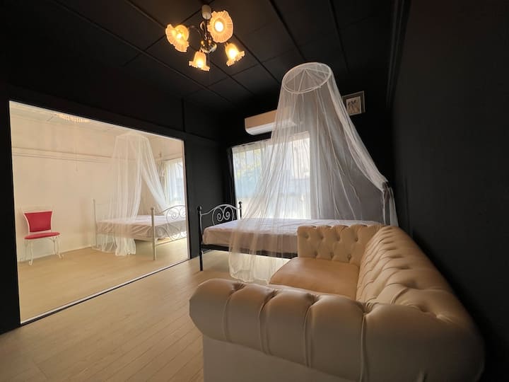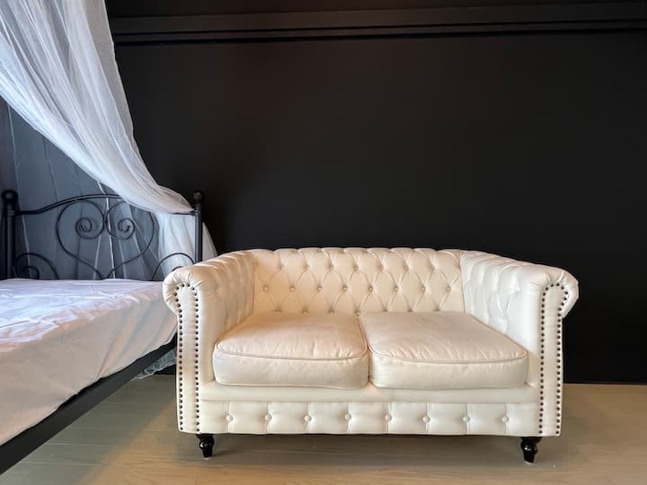 Izba 103: Roztomilá izba s čiernou a bielou interiérovou výzdobou / posteľ s baldachýnom / luster / kuchyňa / 6 minút od stanica