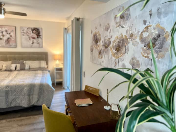 Matrac Master King v spálni 1 s dvoma nočnými stolíkmi, množstvom priestoru v šatníku, vlastnou kúpeľňou, písacím stolom a exkluzívnym prístupom na zadný dvor – ideálny na čerstvý vzduch, keď vychádzate z postele.