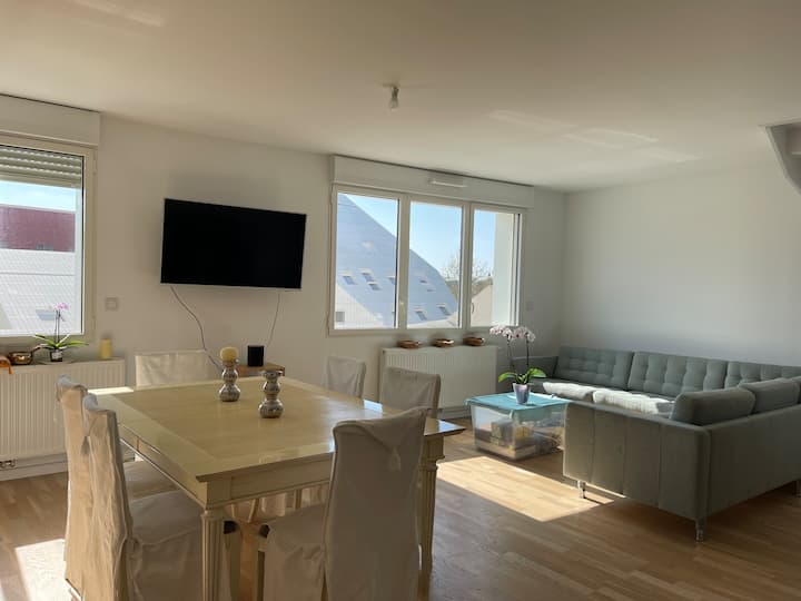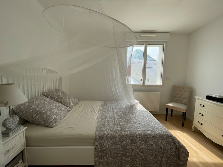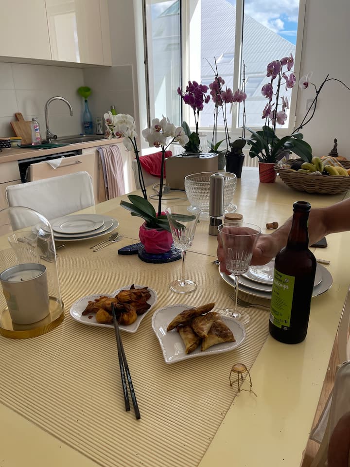 Tento apartmán sa nachádza na najvyššom poschodí nedávno postaveného obytného domu na Quai des Queyries, na pravom brehu Bordeaux, v bezprostrednej blízkosti nábrežia Garonne lemovaného stromami a Darwinu. Priestranný a funkčný apartmán ponúka tiché a svetlé prostredie, ideálne na pobyt s rodinou, priateľmi alebo na služobnú cestu.