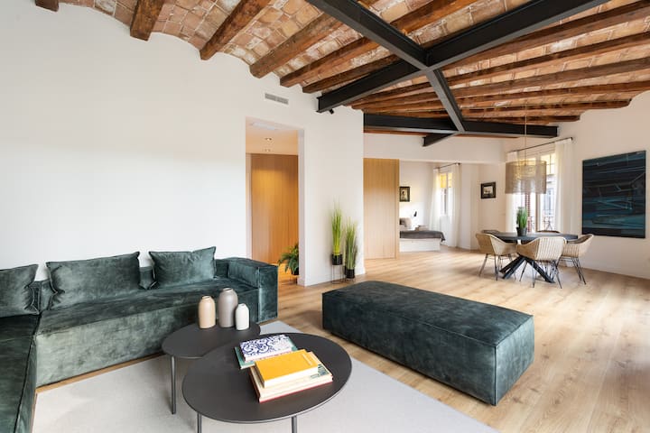Hlavným prvkom obývacej izby sú masívne okná, ktoré prepúšťajú dostatok prirodzeného svetla a poskytujú vám výhľad na okolie nižšie. Vďaka veľkej televízii a veľkej pohovke v rohu je tento priestor skvelým miestom na oddych po dni strávenom v Barcelone. Na druhej strane obývacej izby sa nachádza aj veľký jedálenský stôl. Moderný nádych veľkých drevených posuvných dverí oddeľuje alebo otvára priestor, aby ste našli hlavnú spálňu s manželskou posteľou. Väčšia kúpeľňa je súkromne prepojená s touto izbou. Stropy sú navrhnuté s odhalenými tehlami, ktoré sú v Barcelone klasické.