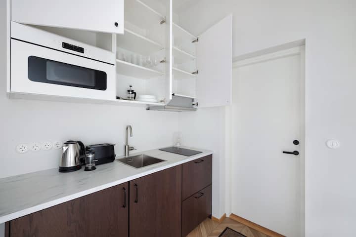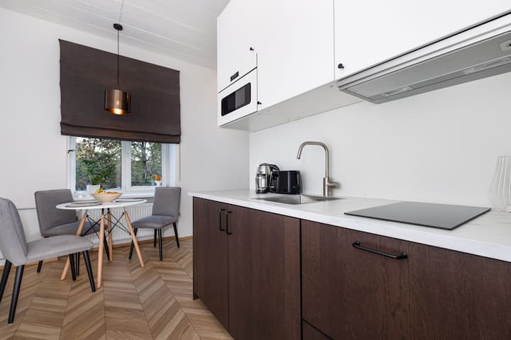 Luxusná samostatná manželská posteľ a kuchyňa, samoobslužné ubytovanie