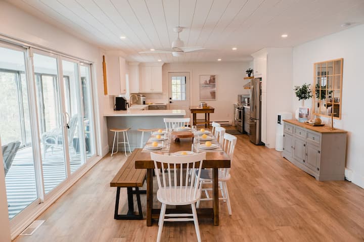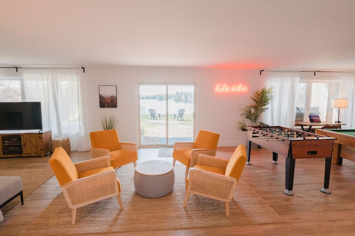 Oddýchnite si, načerpajte nové sily a odpočiňte si v Eagles Landing: príjemnej, krásne navrhnutej chalupke s piatimi spálňami na nádhernom jazere Eagle Lake v South River, ON (2,5 hodiny od Toronta). Tento priestranný štvorsezónny výlet ponúka vírivku, ohnisko, slnečnú miestnosť, gril, herňu (bazén, stolný futbal, hranie hier), kuchyňu šéfkuchára, rýchle Wi-Fi, veľký dvor, piesočnatú pláž a ďalšie. V blízkosti turistických chodníkov (Národný park Mikisew), golfu, jazdu na snežných skútroch, plavbe loďou a ďalších. 45 minút do North Bay alebo Huntsville.