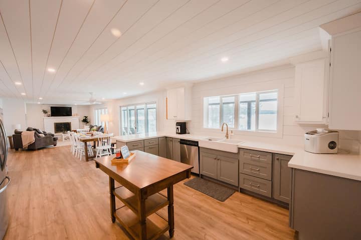 Pripravte si chutné jedlá v našej plne vybavenej kuchyni šéfkuchára, ktorá zahŕňa raňajkový bar, úplne nové spotrebiče z nehrdzavejúcej ocele, farmársky drez a očarujúci drevený ostrov – to všetko pri pohľade z veľkého okna s výhľadom na jazero. Predsieň pri kuchyni poskytuje priestor na topánky/čižmy a ďalšie úložné priestory, ako aj ďalšiu chladničku pre veľké skupiny. Na bočnej terase môžete zapáliť propánový gril. Do chaty sa dostanete ľahko.
