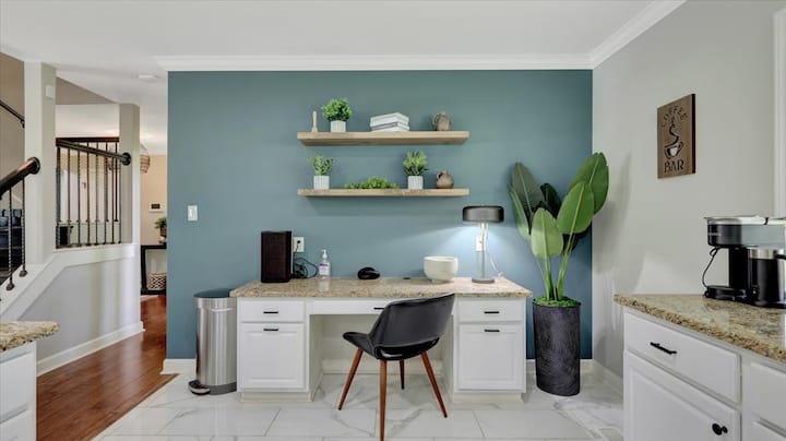Pripravte si všetky jedlá v štýlovej kuchyni, ktorá sa môže pochváliť spotrebičmi z nehrdzavejúcej ocele, vlastnými drevenými skrinkami, žulovými pultami a vyvýšeným raňajkovým barom. Začnite svoje ráno šálkou kávy z kávovaru Keurig. K dispozícii budú kapsule Keurig, takže sa nemusíte obávať, že si ich vyzdvihnete.