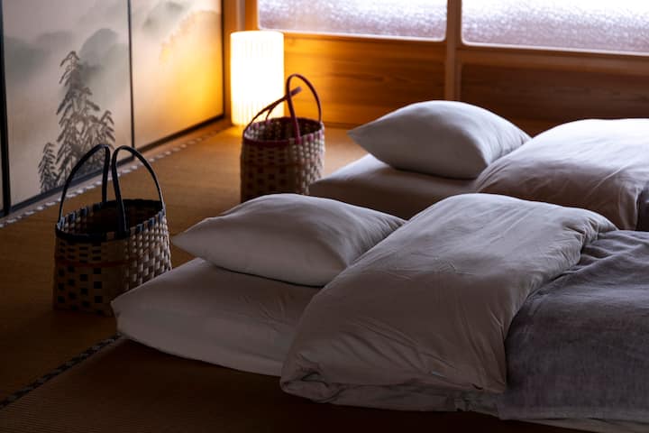Zažite krásu nášho domu postaveného v ranej ére Showa v pokojnej dedinke Iwamura. Ubytujete sa na druhom poschodí, ktoré ponúka štyri tradičné japonské izby, z ktorých každá je oddelená krásnymi posuvnými dverami vyrobenými z papiera washi a vlastnou toaletou. Pre pokojný nočný spánok budete spať na pohodlných japonských bavlnených futónoch.