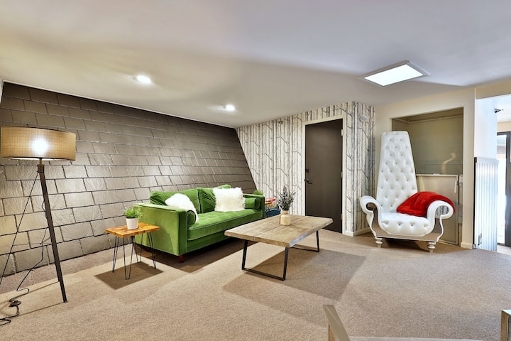 Vitajte v izbe majiteľa, luxusnom dvojposchodovom apartmáne nachádzajúcom sa v The Birch Ridge v srdci Killingtonu vo Vermonte! Tento priestranný a vkusne zariadený apartmán je ideálny pre páry, rodiny a skupiny priateľov, ktorí hľadajú pohodlné a elegantné horské útočisko. Izba majiteľa je vybavená manželskou posteľou Queen v podkroví na poschodí a rozkladacou pohovkou v obývacej izbe, ktorá pohodlne ubytuje až štyroch hostí. Obývacia izba sa môže pochváliť 55-palcovým inteligentným televízorom na zábavu a relaxáciu. Kuchynka je plne vybavená umývačkou riadu, mikrovlnnou rúrou, kávovarom Keurig, minichladničkou, varnou doskou s dvoma horákmi, taniermi, riadom a skleneným riadom. Pult na polostrove poskytuje dostatok priestoru na prípravu a vychutnanie si jedla, zatiaľ čo malý jedálenský stôl je ideálnym miestom na stretnutie a vychutnanie si jedla s priateľmi a rodinou. Apartmán ponúka aj krásny výhľad do záhrady a vytvára pokojné a pokojné prostredie. Vlastná kúpeľňa je vybavená sprchovacím kútom. Ako hosť v Birch Ridge Inn budete mať prístup ku širokej škále zdieľaného vybavenia, ktoré určite zvýši váš pobyt. Salónik má plynový krb, pohodlné posedenie s TV a spoločenskými hrami a plne zásobenú kávovú stanicu. Biliardový stôl a stôl na šuffleboard poskytujú hosťom všetkých vekových kategórií. Práčovňa je hosťom k dispozícii, aby ste si mohli zabaliť svetlo a zostať svieži počas celého pobytu. A keď ste pripravení si oddýchnuť, zamierte do jednej z dvoch spoločných víriviek, kde si môžete vychutnať svoje starosti a zároveň si vychutnať nádherný výhľad na hory.