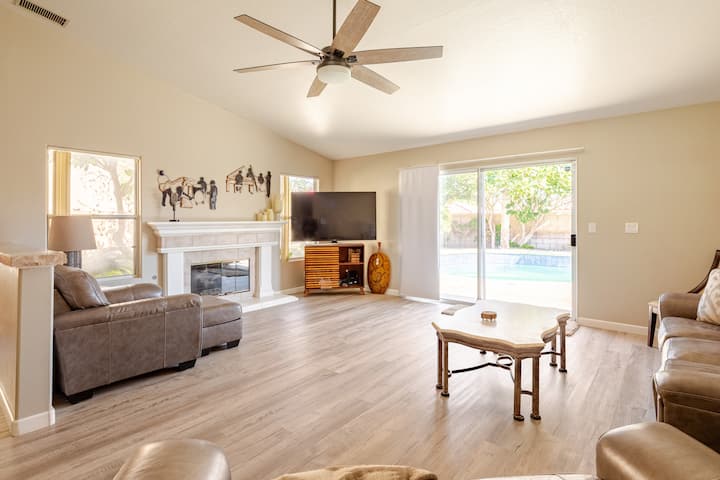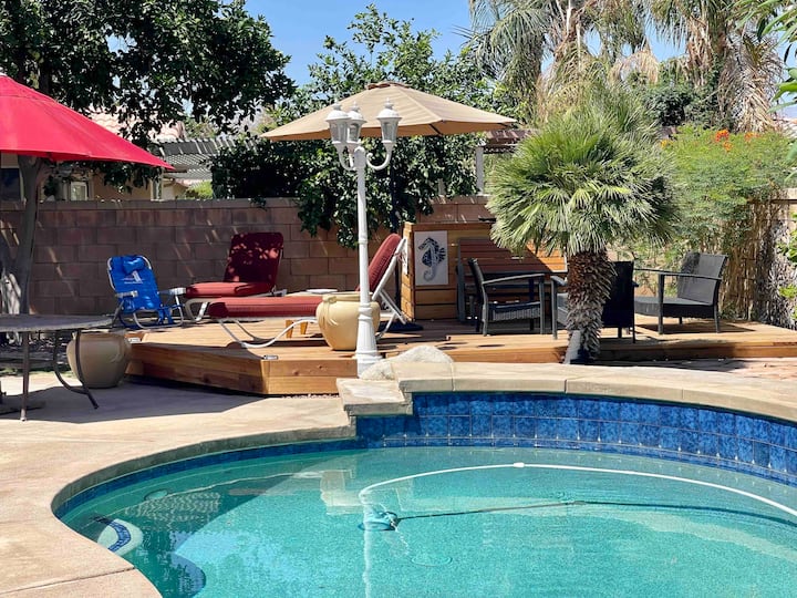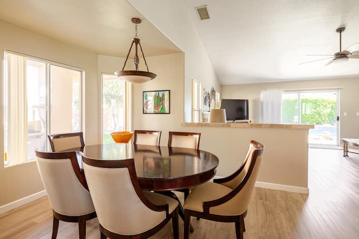Nová ponuka! Otvorený pôdorys, dovolenkový dom s rozlohou 1 800 štvorcových stôp s vysokými stropmi v blízkosti Coachelly, dostavníka, tenisových turnajov v Indian Wells, hudobných festivalov, golfu, tenisu, turistiky, stravovania, letiska, obchodov, kasín a priamo pri 111 Hwy. Táto 3-izbová, 2,5 kúpeľňová púštna vila má všetko a je vkusne vybavená špičkovým nábytkom, novými luxusnými vinylovými podlahami a dlaždicami. Obývacia izba má pohodlnú pohovku, ktorá môže ľahko pojať 6 osôb, s jedálenským stolom schopným sedieť 6. Dom obsahuje veľa vybavenia, ktoré by ste očakávali v najlepších hoteloch s bezdrôtovým pripojením na internet, 3 NOVÉ veľké inteligentné televízory, nové postele atď., aby sa cítili pohodlne.