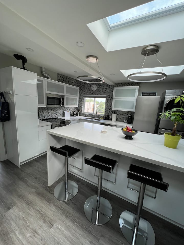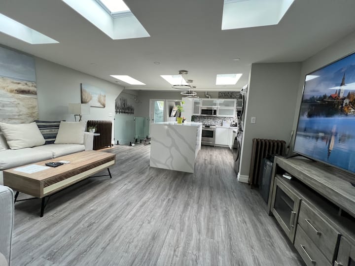 Na 3. poschodí sa nachádza svetlý, moderný, súkromný apartmán 1-1 v Leslieville/Upper Beaches. Krásne špičkové povrchové úpravy, plné prirodzeného svetla, svetlíky, plne vybavené všetkým, čo môžete potrebovať. Obývacia izba má veľkú nadrozmernú pohovku, veľkú 85" LED smart TV so všetkými kanálmi, vlastný vchod, manželskú posteľ s TV. Všetko je v tesnej blízkosti: pláže, štvrť Little India, Danforth, nemocnica Michael Garron. Pešia vzdialenosť od miesta konania podujatia History Drake
